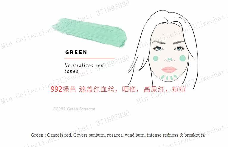 用来调整肤色的遮瑕膏会有不同颜色,绿色遮瑕膏可以遮盖你脸部发红的皮肤,比如伤疤或者痘痘。绿色遮瑕膏遮盖粉刺的效果更好, 但是不要将绿色遮瑕膏用在脸部黑暗的部分,比如黑眼圈,这样会适得其反。