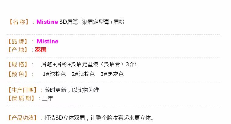 mistine3D眉笔笔芯的原理。如果打开包装发现笔芯掉出!不是断了哦(笔芯本身长度)是本身设计如此,类似一种换芯的铅笔!!往右边旋转把笔芯扭到尽头是可以把笔芯取出的。那么先不要旋转笔筒了,小心安装好后,往左旋转就可以把笔芯转动回去了!也不要试图去看这个笔芯有多长然后拧到尽头说笔芯断裂了!放回到合适位置拧紧即可。