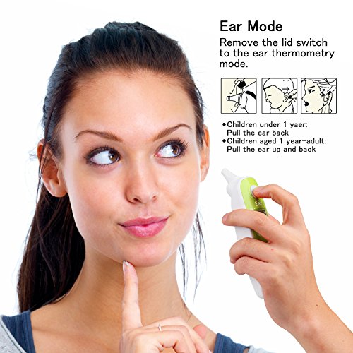 Note 1. Infant under 12 months: Please pull the ear slightly backwards 2.Children over 12 months and adults: Please pull the ear slightly up and backwards 3.Newborn under 6 months : Suggest applying forehead mode. 4. Because of the external environment' different, it is normal to obtain a slight variation in temperature readings when test in different parts of the body. Package list: 1x baby thermometer 1x manual 2x AAA Batteries