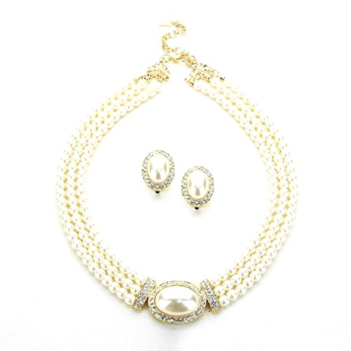 Gorgeous three Strands of Cream Simulated-Pearl With Clear Rhinestone Crystal Pavé round Gold tone medallion necklace it comes with elegant matching free Clip on Stud earrings.