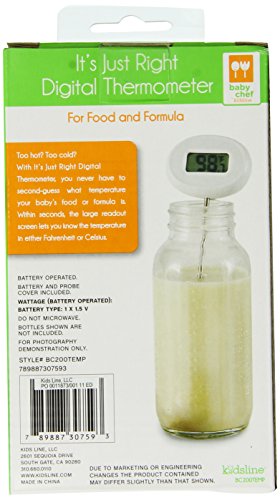 -. Binding : Baby Product -. Brand : Baby Chef -. Color : White -. Department : baby-boys -. EAN : 0789887307593 -. Feature : Large digital display with on/off controls. / Long stainless steel temperature probe fits directly into short or tall feeding bottles for accurate readings. / Adjustable Fahrenheit /Celsius readout. / Battery and probe cover included. / Product Dimensions: 2 x 1.1 x 5.2 inches. -. IsAdultProduct : 0 -. Label : Kids Line -. Manufacturer : Kids Line -. Model : BC200TEMP -. MPN : BC200TEMP -. PackageQuantity : 1 -. PartNumber : BC200TEMP -. ProductGroup : Baby Product -. ProductTypeName : BABY_PRODUCT -. Publisher : Kids Line -. ReleaseDate : 2011-02-18 -. Studio : Kids Line -. Title : Baby Chef It's Just Right Digital Thermometer (Discontinued by Manufacturer) -. UPC : 789887606863