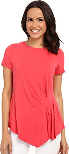 Flaunts side ruching detail that creates a lovely draped look. Round neckline. Short sleeve design. Asymmetrical hemline. 96% viscose, 4% elastane. Machine wash cold, tumble dry low. Imported.