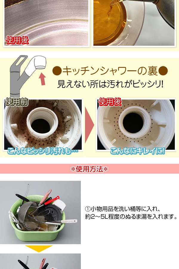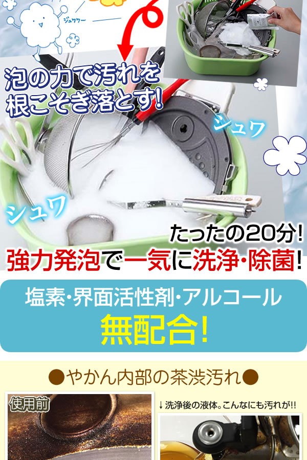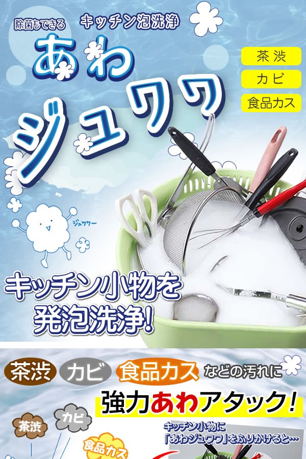 | <h1>洗ったつもりのキッチン小物に残った汚れが雑菌や臭いのもとに。「キッチン泡洗浄 あわジュワワ」なら強力発泡で、スポンジでは落とせない汚れに入り込む!茶渋やカビ、食品カスに。塩素・界面活性剤・アルコールは無配合。除菌/キッチン/洗浄剤/洗剤/洗浄剤/キッチン用品/台所用洗剤/過炭酸ナトリウム/酸素系/かび/</h1> |