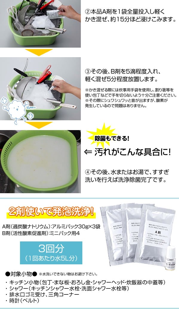 | 【成分】A剤:過炭酸ナトリウム、B剤:活性酸素促進剤 |