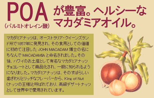全国のマッサージショップやエステサロンから業務用としてケース注文が定番化している品質保証品。 コレステロール“0”、パルミトオレイン酸を豊富に含むヘルシーなマカダミアオイル。「植物油の中でもっとも酸化しにくい」ことでも知られています。 お勧めとしては、オイルマッサージへの使用です。小さなスプレー缶に詰め替え、風呂上がりや水仕事のあと肌への塗布をお試しください。 ソースやドレッシングの調味料としてはもちろん、酸化しにくく熱に強いので炒め物にも最適です。 ※発火温度の関係で天ぷらにはお勧めしていません。 ※寒冷時、底に白濁したものができますが、天然のオイルに共通した現象で、品質に問題はありません。 暖まると元に戻ります。保存方法は蓋をして冷暗所に保管してください。