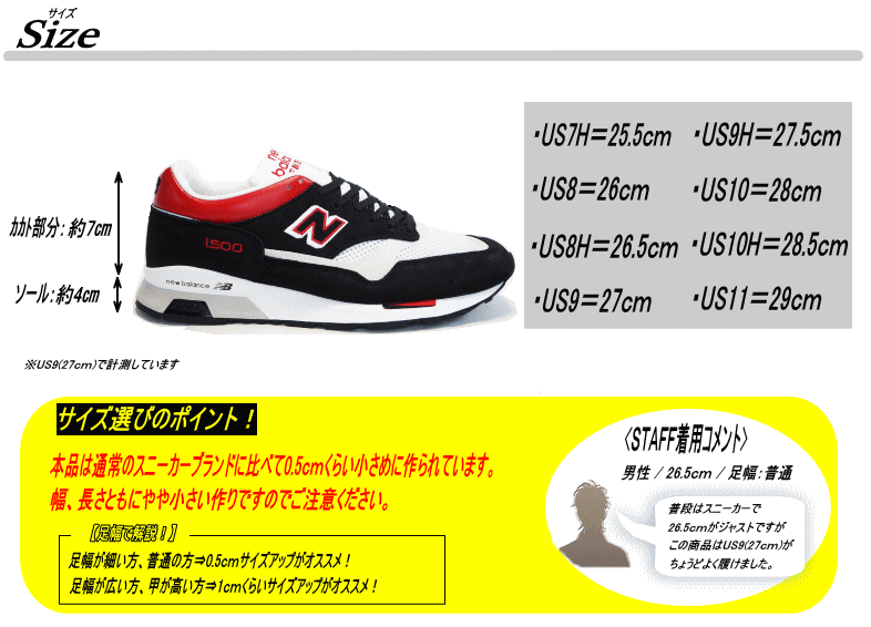 | サイズ | 作り⇒やや小さめ 【サイズ選びのポイント!】 足幅が細い方、普通の方⇒0.5cmくらいサイズアップがオススメ! 足幅が広い方、甲が高い方⇒1.0cmくらいサイズアップがオススメ! |