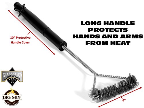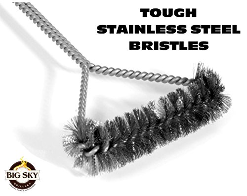 - Title : Grill Brush 21" - 3 Sided Barbeque Grill Cleaning Tool is Best For Hard To Reach Areas on Charcoal, Gas, Electric, Commercial, Char Broil and Weber BBQ Grills - Stainless Steel Bristles - Stronger Than Brass - Safe for Use on Porcelain, Stainless Steel, & Cast Iron Barbecue Grill Grates - Long Heavy Duty Wire Handle With Black Protective Cover Protects Hands & Arms from Heat - FREE With Your purchase: Silicone Basting Brush and eBook of Grilling Tips and Recipes - Quality Grilling Accessories Available From Big Sky Grillers - Full One Year Guarantee