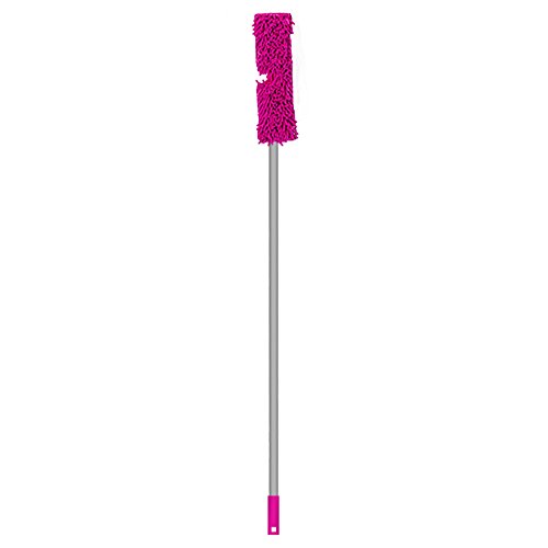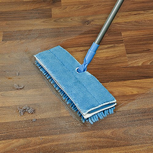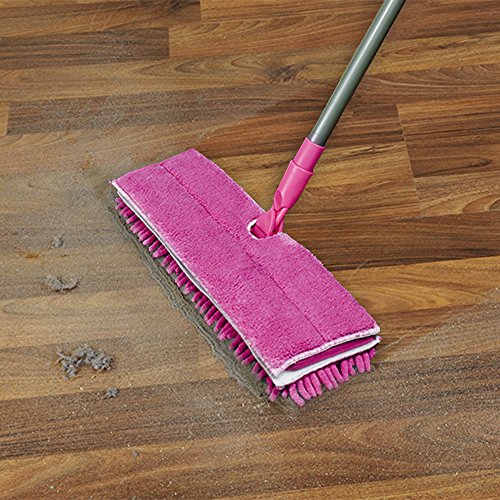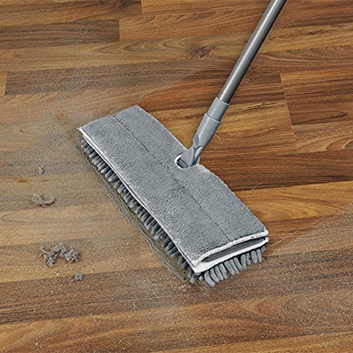 The dual-action flip flop mop features a head that is double sided microfiber and chenille for wet and dry cleaning