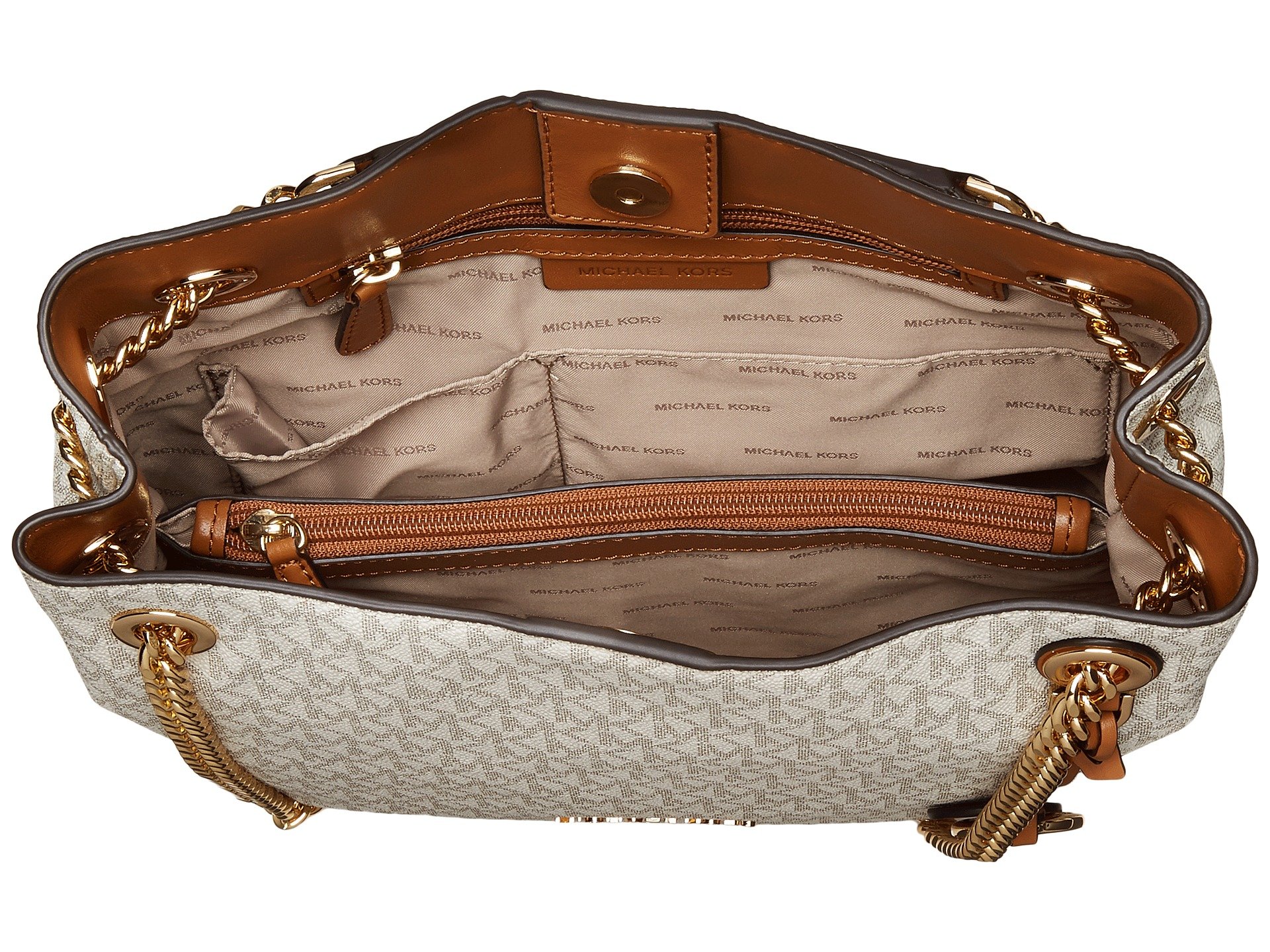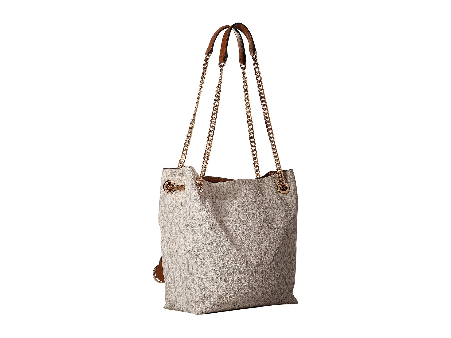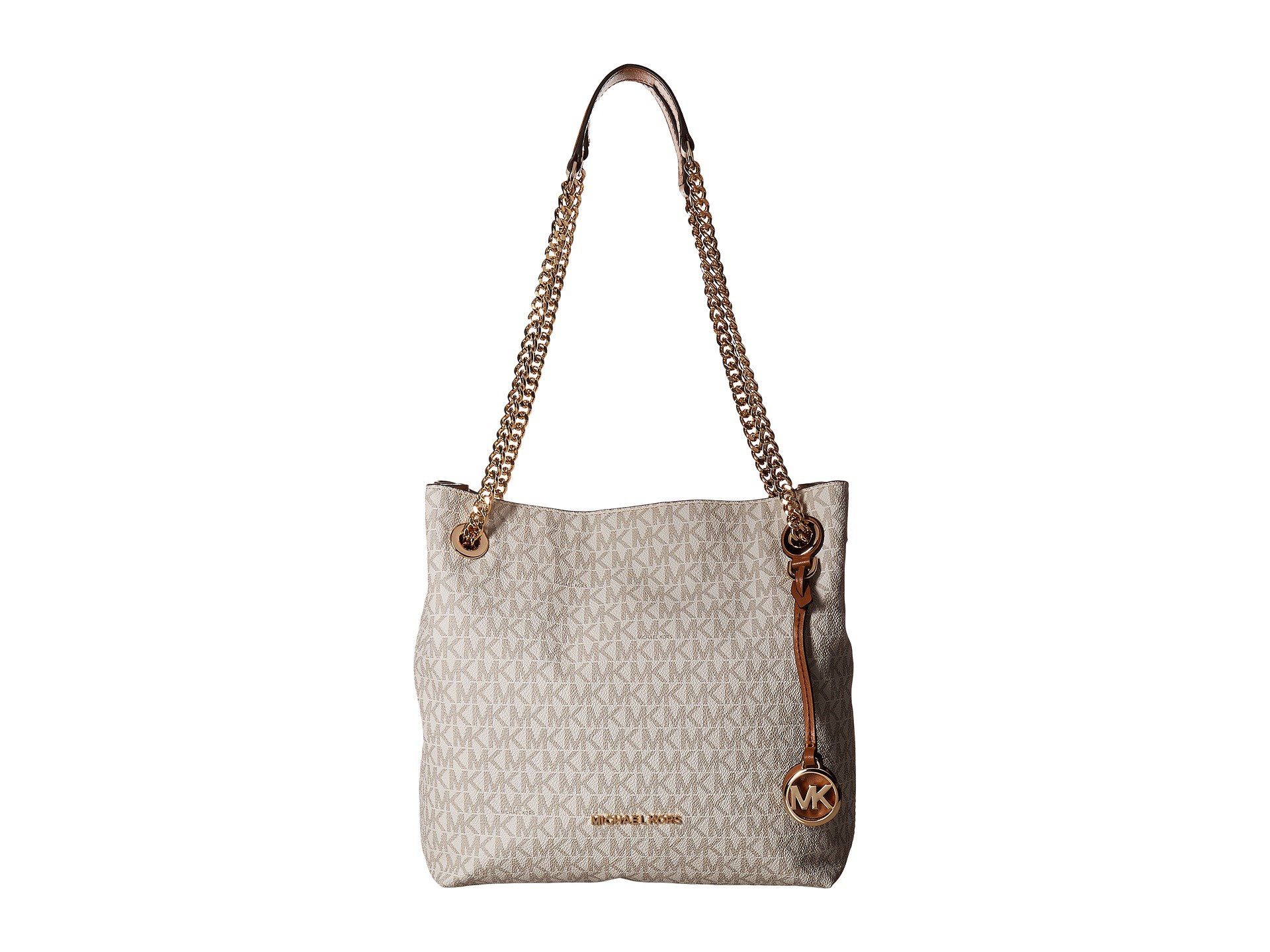 | Product Information SKU: #8976624The MICHAEL Michael Kors? Jet Set Chain Medium Messenger is sleek and edgy while maintaining an air of class and sophistication. We absolutely cannot get over her!Made of logo printed pebbled leather.Open construction with magnetic closure.Dual chain shoulder straps with leather detail for comfort.Flat base to provide upright structure.Signature silver-tone logo hardware detail and bag charm in front.Customer woven lined interior.Interior features a center zipper compartment, slip pockets, and a back-wall zip pocket.Imported.This product may have a manufacturer's warranty. Please visit the manufacturer's website or contact us at warranty@support.zappos.com for full manufacturer warranty details.Measurements: Bottom Width: 9 in Depth: 3 1?2 in Height: 9 1?2 in Strap Length: 26 in Strap Drop: 12 in Weight: 1 lb 12 oz |