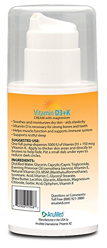 5000 IU of Vitamin D3 + 150 MCG Vitamin K, with Magnesium. Renews Dry and Damaged Skin, Helps fade Bruising and Dark Circles. Helps alleviate conditions of Pyrosis, and Eczema however we do not advertise that on the label, but we have customer who buy just for that reason.Feature