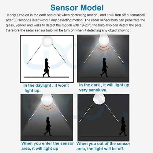 - ★RADAR SENSOR: The motion sensor bulb is radar sensor light bulb, it's much more sensitive,more responsive and more penetrating than infrared sensor bulb. It’s smart bulb with built-in dusk to dawn sensor. The motion sensor light bulb can penetrate the glass, veneer and walls to detect the motion within 19-26ft, the led sensor bulb also can detect the pets , therefore the radar sensor bulb will turn on when it detecting any object moving .