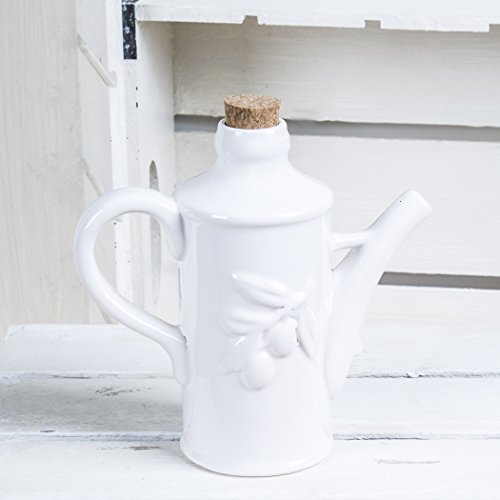 White Ceramic Olive Oil Dispenser Bottle - Oil Dispensing Cruet -Pretty Embossed Bottle With Handle and Spout and Cork Stopper