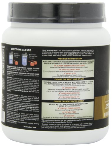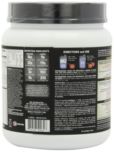-. Binding : Health and Beauty -. Brand : Cytosport -. Color : Brown -. Department : unisex-adult -. EAN : 0885707164169 -. Feature : Consists of a precise blend of multi-source proteins, functional fats, low-sugar carbohydrates and 20 vitamins and minerals in a lactose-free formula / Provides healthy, sustained energy and recovery for performance and lifestyle / Contains trans-fat free functional fats used as a source of energy / Muscle Milk is an ideal nutritional choice -. IsAdultProduct : 0 -. Label : Cytosport -. LegalDisclaimer : * These statements have not been evaluated by the Food and Drug Administration. This product is not intended to diagnose, treat, cure or prevent any disease. ** Always refer to the manufacturer's label on the product for description, recommended dose and precautions. -. Manufacturer : Cytosport -. Model : 1493 -. MPN : 1493 -. NumberOfItems : 1 -. PackageQuantity : 1 -. PartNumber : 1493 -. ProductGroup : Health and Beauty -. ProductTypeName : HEALTH_PERSONAL_CARE -. Publisher : Cytosport -. Size : 1 Pound -. Studio : Cytosport -. Title : CytoSport Muscle Milk Lean Muscle Protein Powder, Chocolate, 1 Pound -. UPC : 660726502327