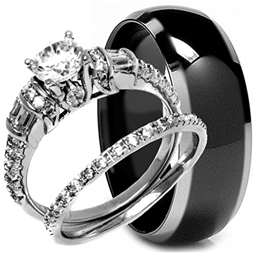 -. Title : 3 Pieces Men's and Women's, His & Hers, 925 Genuine Solid Sterling Silver & Black Carbon Fiber Titanium Engagement Matching Wedding Anniversary Ring Set