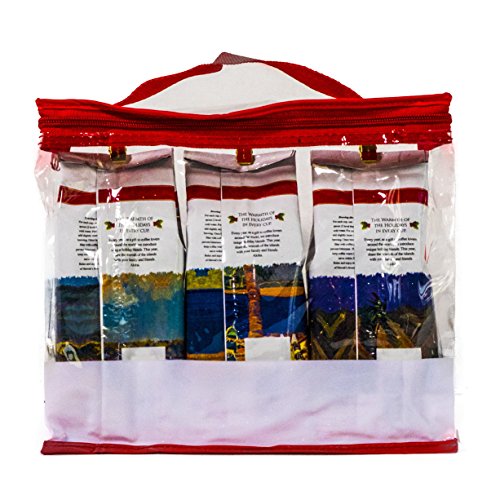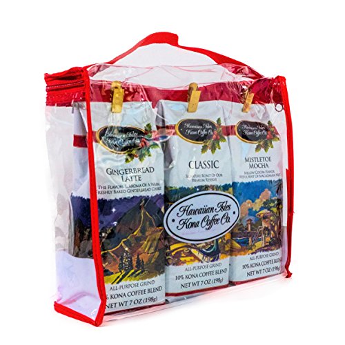 This holiday coffee gift will be a hit for coffee lovers to make the most anticipated morning of the year even more exciting with this delicious, aromatic and so indescribably satisfying Hawaiian Kona Coffee! Each plastic Tote has a red trim handle with zipper. These make popular Christmas gifts and contain 3 (7 oz.) bags of delicious 10%Kona ground coffee specially made for the holiday. One bag of each of the following flavors of our Holiday lineup: Kona Classic, Kona Mistletoe Mocha, and Kona Gingerbread Latte. Hawaiian Isles Kona coffee blends uses Kona Coffee beans grown on the Big Island's Kona Coast where nature's elements combine to form perfect coffee growing conditions throughout the year. We blend this rich coffee with the finest arabica beans from around the world to bring you a truly unique gourmet taste. Kona Classic: Our signature roast of Hawaiian coffee and a best-selling favorite (this is the holiday packaging). Kona Classic is medium-roasted to suit most peoples' taste. Kona Classic is a Kona blend that combines 10% Kona coffee and fine Arabica coffee from around the world to give you an unforgettable taste. All-purpose grind packaged in our NEWLY DESIGNED limited edition Diamond Head holiday packaging. Kona Mistletoe Mocha: Mellow cocoa flavor with a hint of macadamia. Mistletoe Mocha is a Kona blend containing at least 10% Kona coffee. It is a medium-roast in our limited edition Waimea holiday packaging. Kona Gingerbread Latte: The flavors and aroma of a warm, freshly baked gingerbread cookie. Gingerbread Latte is a Kona blend containing at least 10% Kona coffee. It is a medium-roast in our limited edition Koolau Mountain holiday packaging. Our flavored coffee contains no gluten and is Kosher certified. Click the "Add to Cart" button to order yours NOW while supplies last!Feature