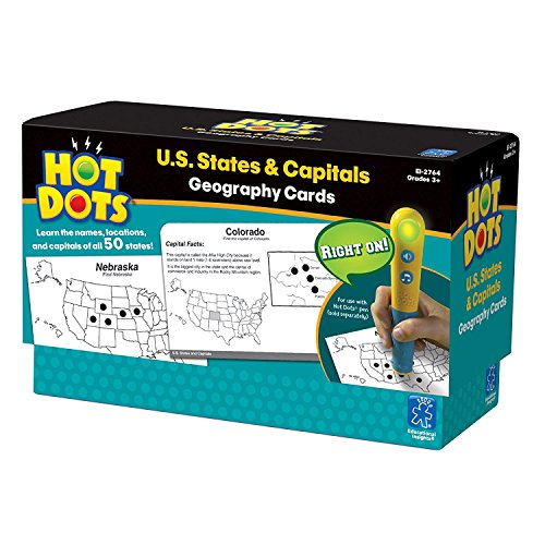 Flash cards quiz state locations on one side, and capitals on the other. Learn about state birds, flowers, nicknames, and other facts. The Talking Hot Dots Pen (sold separately) provides instant feedback with audio and visual reinforcement for correct and incorrect answers. Packed in a durable plastic storage box, this set includes 50 two-sided cards and a guide. Cards measure 5" W x 3.5" H each. Grades 3+ / Ages 8+.