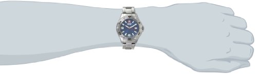 Stainless steel bracelet watch featuring unidirectional bezel and blue dial with logo, date window, and luminous hands/markers
