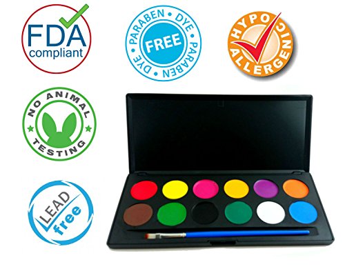 - 12 COLOR Face Paints with brush. GENTLE TO YOUR SKIN! Face Painting Kit or Body Paint with Hard Travel Case for storage , easily carry-along and protection from water spill. Great face paint for kids.