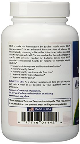 -. Binding : Health and Beauty -. Brand : Best Naturals -. Feature : Supports calcium uptake and bone mineralization* / Supports healthy bones* -- Supports healthy cardiovascular function* / Supports healthy kidney function* -- Supports healthy aging* / Certified free of allergens by an independent, third-party lab / All Best Naturals products are manufactured in accordance with Good Manufacturing Practices (GMP), among the highest standards in the world -- Proudly Made in USA -- Purity & Potency Guaranteed -. Label : Best Naturals -. Manufacturer : Best Naturals -. ProductGroup : Health and Beauty -. ProductTypeName : HEALTH_PERSONAL_CARE -. Publisher : Best Naturals -. Studio : Best Naturals -. Title : Best Naturals MK-7 Vitamin K2 100 mcg 120 Vcaps