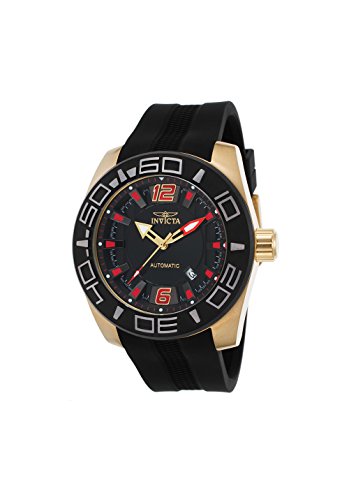 -. Binding : Watch -. Brand : Invicta -. Color : black -. Department : mens -. EAN : 0886678286461 -. Feature : Precise 24 Jewels Automatic Movement; Date Window Between 4:00 and 5:00; Luminous; Unidirectional Black Ion-Plated Bezel; Screw-Down Crown / Black Dial with Gold Tone, Red and White Hands and Black and Red Hour Markers; Flame Fusion Crystal; Exhibition Case Back; 18k Gold Ion-Plated Stainless Steel Case; Black Silicone Strap / Automatic-self-wind Movement / Case Diameter: 50mm / Water resistant 200m (660ft): in general, suitable for professional marine activity and serious surface water sports, but not diving -. Label : Invicta -. Manufacturer : Invicta -. Model : 23531 -. MPN : 23531 -. PackageQuantity : 1 -. PartNumber : 23531 -. ProductGroup : Watch -. ProductTypeName : WATCH -. Publisher : Invicta -. Studio : Invicta -. Title : Invicta Men's 'Aviator' Automatic Stainless Steel and Silicone Casual Watch, Color:Black (Model: 23531) -. UPC : 886678286461
