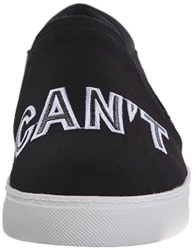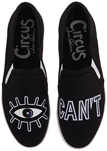 Slip-on sneaker featuring one shoe with eye-shape applique and the other with "CAN'T" stitched at vamp