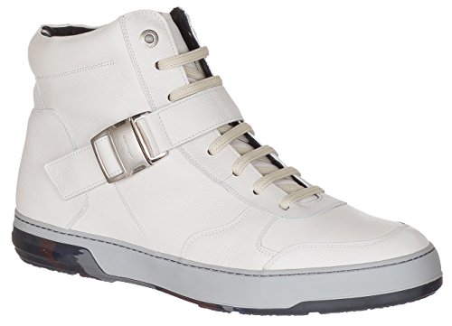 Product Description Salvatore Ferragamo Men's Off-White Leather Zip Buckle Mulberry High Top Sneakers Shoes Made in Italy Bold high-tops with signature buckle Calf leather Lace-up front Side zip and push-lock strap closure Gunmetal-tone hardware Leather/fabric lining Rubber Camouflage sole Lightly padded insole Includes dust bag