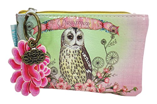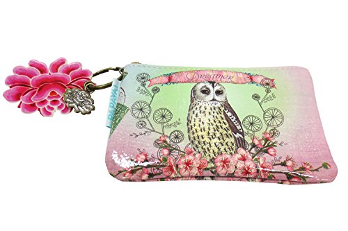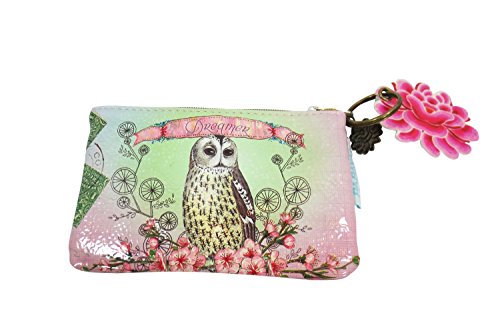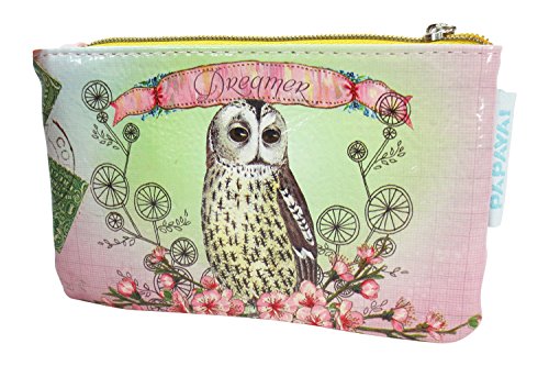 Product Description Beautiful and pretty mini coin purse by Papaya Art. It features durable oil cloth canvas with amazing owl, and beautiful flower art on front and back and zipper closure on top with Lotus charm and key ring. 0