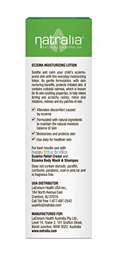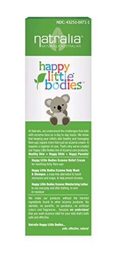 Natralia Happy Little Bodies Eczema Moisturizing Lotion is a non-steroidal, daily moisturizer that is gently formulated to soothe and protect your child's Eczema-prone skin. It is clinically proven to moisturize your child's Eczema-prone skin for up to 24 hours and contains Jojoba Oil to replenish moisture and promote healthier skin. For daily use, especially after bathing. Leaves your child's Eczema-prone skin feeling soft and not greasy. Free from artificial colors and fragrance.