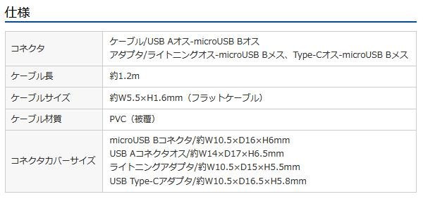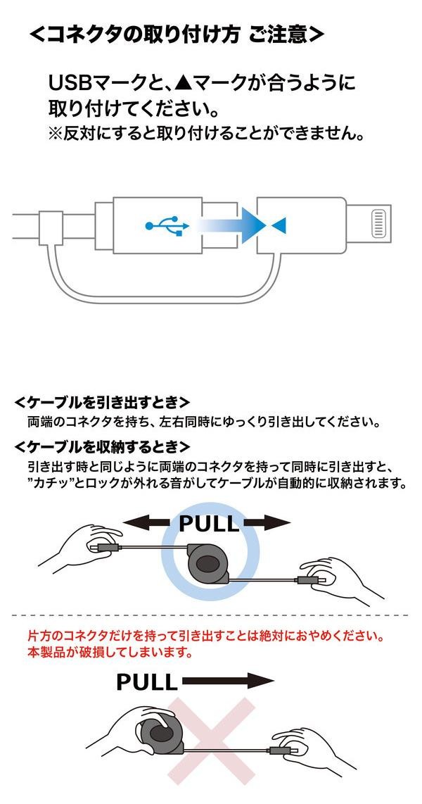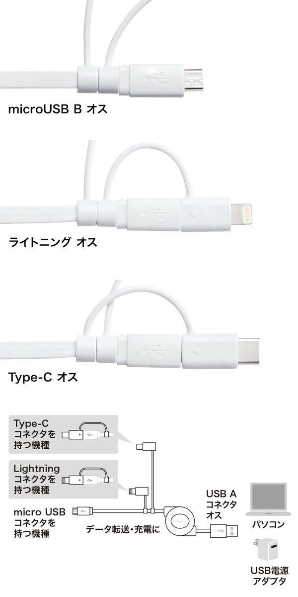 ライトニング・Type-C・microUSB Bの3種類のコネクタに対応する巻取りUSBケーブルです。Apple社 MFi認証取得品です。iPhone・iPadや端末機器をパソコンに接続してデータの通信や充電(対応機種のみ)ができます。 |