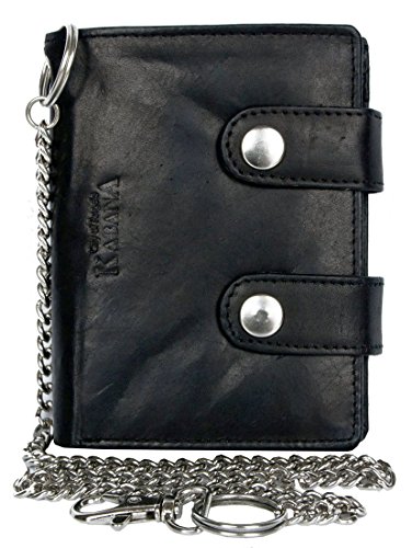-. Feature : Men's black biker's genuine leather wallet Kabana / With two buckles to close safe / Dimensions 4.7 x 3.5 in (12 x 9 cm) metal chain 17.5 in (45 cm) / Trifold, vertical / German design