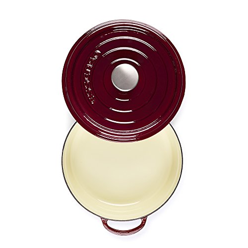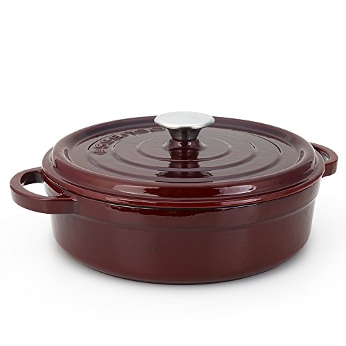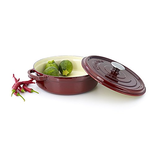 Studio : ESSENSO Publisher : ESSENSO Binding : Kitchen Product Description Measurements - Handle-to-handle: 14 inches. Rim-to-rim: 11 inches. Cooking surface (base): 10 inches. Depth: 3 inches. Unique, design cast-iron shallow dutch oven/braiser/casserole with added functionality, ease-of-use, and beautiful cream interior with cherry glaze. Great for braises, shallow slow-cooking, casseroles ? any recipe that begins with searing/browning/braising and continues in the oven! In addition to cast iron’s superior heat retention and even heat distribution properties, Essenso’s 3-layer enameled cast iron braiser doesn’t require seasoning, its impermeable surface can be used with acidic foods and wine, and it’s resistant to cracking and rusting. Easily tolerates up to 500F in the oven. Can be used with induction. Smooth surface is more user friendly with glass stoves than traditional cast iron cookware. Enamel and ceramic coating allow for good food release properties when lightly lined with cooking oil and used on medium-low heat. Promotes easier to clean, healthier, residue-free cast-iron cooking. PTFE-free, natural, healthy. If preheated on low-medium heat, cast iron doesn’t require higher heats that lead to food sticking and burning. Lid features moisture marks that lock in flavor and moisture to tenderize meats and prevent drying. A beautiful piece to present on the table straight out of the oven or off the stove. Cast iron heat retaining properties will keep food hot on the table. Great for mac and cheese, lasagne, risotto, rice, applesauce, baked beans and searing meats before continued cooking in the oven. With its large cooking surface and cast iron’s even heat distribution properties, this pan works great for frying, poaching and sauteing recipes as well! 0