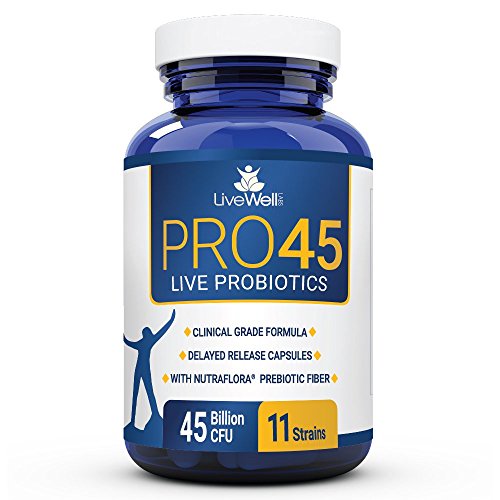 Why is PRO-45 the Best? Pro45 was designed to be your go-to gut and digestive system multi-vitamin. Pro45 helps to promote an optimal gut bacteria balance. You get 45 billion live active cultures from 11 clinically studied strains in a special capsule designed to resist stomach acid, helping the live cultures get to the intestinal tract. Clinically Studies SubStrains When choosing an effective probiotic it's important to have a variety of robust strains. Many probiotics on the market only offer 3 or 4 strains, Pro45 has 11 of the highest quality strains. Most probiotic formulations do not list their specific substrains which is a big red flag. Avoid generic strains and stick with clinically studied strains that have proven to be effective. Bifidobacterium lactis Bl-04, Lactobacillus acidophilus La-14, Bifidobacterium longum Bl-05, Bifidobacterium bifidum Bb -06, Lactobacillus casei Lc-11, Lactobacillus plantarum Lp-115, Lactobacillus salivarius Ls-33, Lactobacillus rhamnosus Lr-32, Lactobacillus bulgaricus Lb-87, Lactobacillus gasseri Lg-36, Lactospore. See images to learn more. 4x MORE PREBIOTIC FIBER than any amazon brand. The highly effective prebiotic NutraFlora Fiber is included to help boost the vitality and growth of the imperative Bifidobacteria and Lactobacilli strains. This ensure your live cultures are active and healthy. Prebiotic fiber also helps to maintain the vitality of the gut, helping to take our probiotics to a higher level of good gut bacteria. Non-Dairy, Non-GMO, Gluten Free, Soy Free, Preservative Free, Vegan. No synthetic additives or fillers. WHAT PRO-45 CAN DO FOR YOU: -Improve digestion and the breakdown of foods -Boost your immune system -Reduce painful gas, bloating and diarrhea -Promote healthy circulation -Encourage regular bowel movements -Aid in maintaining healthy cholesterol levels 0 |