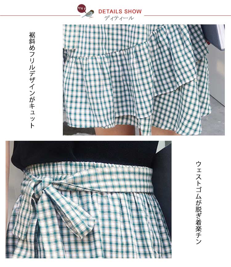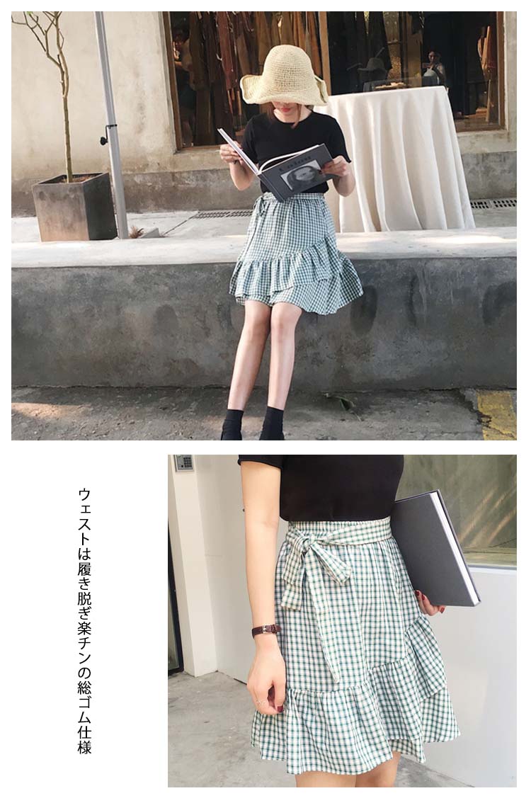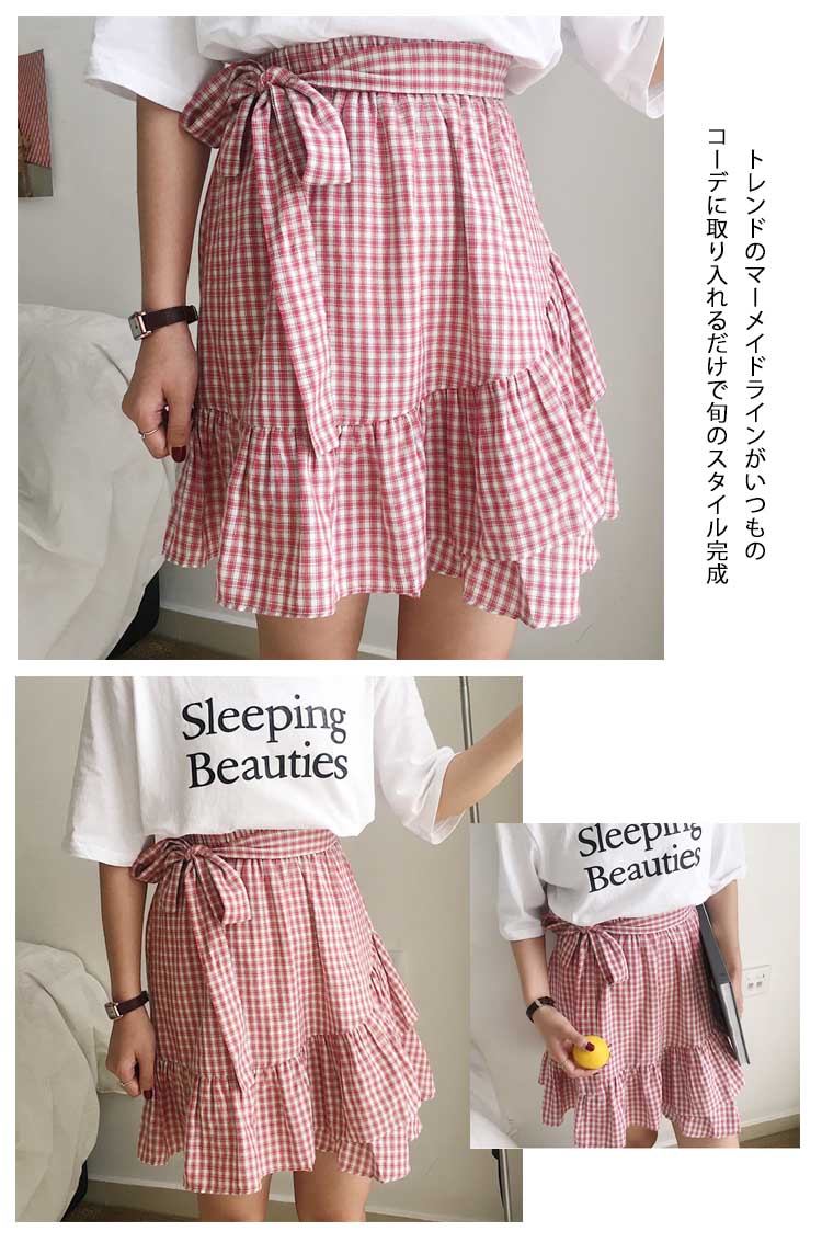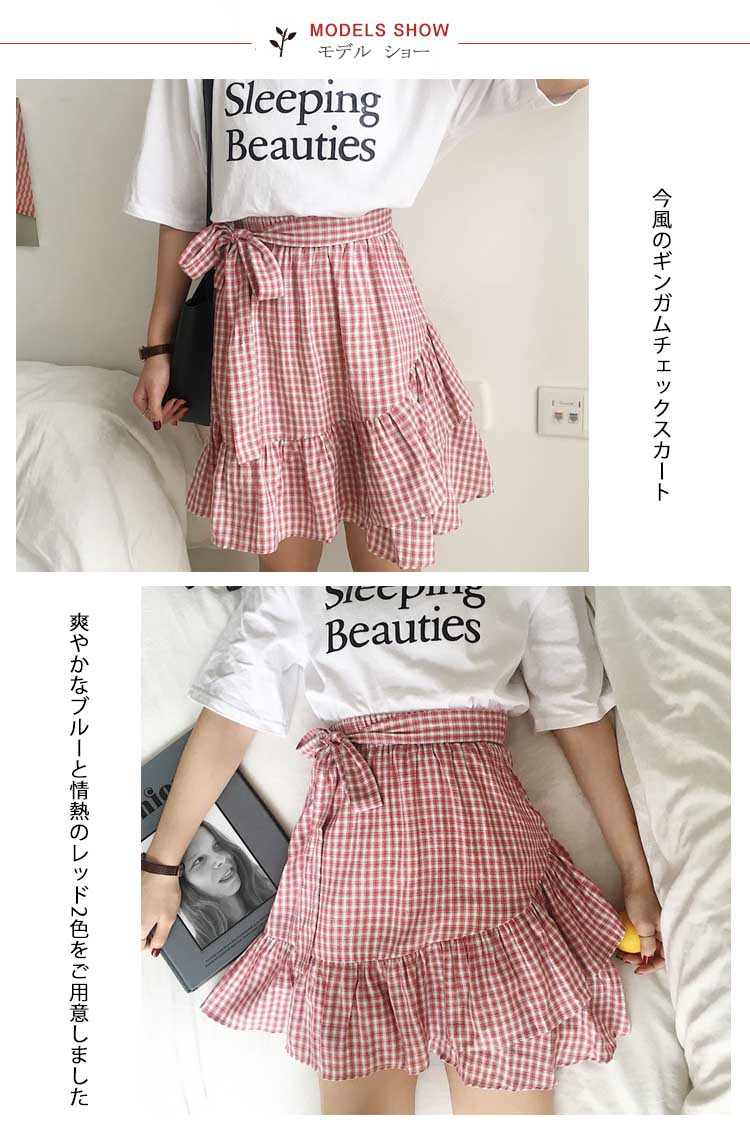 | 今風のギンガムチェックスカート爽やかなブルーと情熱のレッド2色をご用意しましたトレンドのマーメイドラインがいつものコーデに取り入れるだけで旬のスタイル完成ウェストは履き脱ぎ楽チンの総ゴム仕様共布ベルトをリボン結べばアクセントに | |