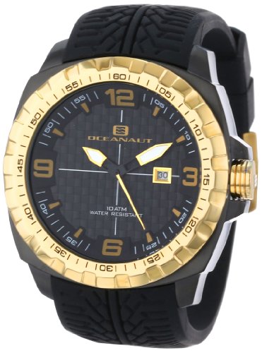 -. Binding : Watch -. Brand : Oceanaut -. Color : Black -. Department : mens -. EAN : 0728795395223 -. Feature : Round black watch with checkerboard-textured dial featuring date window, gold-tone bezel, and ridged crown / 47 mm stainless steel case with mineral dial window / Quartz movement with analog display / Black rubber band with tire-tread texturing and buckle closure / Water resistant to 100 m (330 ft) -. Label : Oceanaut -. Manufacturer : Oceanaut -. Model : OC1112 -. MPN : OC1112 -. NumberOfItems : 1 -. PackageQuantity : 1 -. PartNumber : OC1112 -. ProductGroup : Watch -. ProductTypeName : WATCH -. Publisher : Oceanaut -. ReleaseDate : 2013-08-12 -. Size : Standard -. Studio : Oceanaut -. Title : Oceanaut Men's OC1112 Racer Gold-Tone Stainless Steel Watch with Tire-Tread Band -. UPC : 728795395223 -. Warranty : 2 Year Warranty from Oceanaut