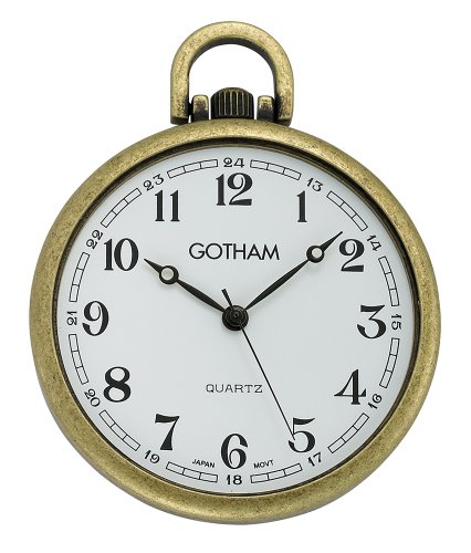 -. Binding : Watch -. Brand : Gotham -. Department : Mens -. EAN : 0050014150284 -. Feature : Classic open face antiqued gold-tone pocket watch with ultra thin polished brass case suitable for engraving / Rich white dial with classic black Arabic numbers and antique style black hands / Precision Japanese analog quartz movement / Includes matching 14" curb pocket watch chain with spring ring attachment / Arrives in gift packaging that does not need wrapping, operating instructions and a lifetime limited warranty -. Label : Gotham -. Manufacturer : Gotham -. Model : GWC15028A -. MPN : GWC15028A -. PackageQuantity : 1 -. PartNumber : GWC15028A -. ProductGroup : Watch -. ProductTypeName : WATCH -. Publisher : Gotham -. Studio : Gotham -. Title : Gotham Men's Antique Gold-Tone Ultra Thin Railroad Open Face Quartz Pocket Watch # GWC15028A -. UPC : 050014150284