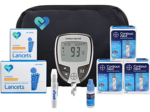 COMPLETE STARTER KIT: Bayer Contour NEXT Diabetes EZ meter, 150 test strips, 100 twist off sterile lancets (30g), lancing Device, Control Solution, Batteries for meter, manual, log book & carry case.