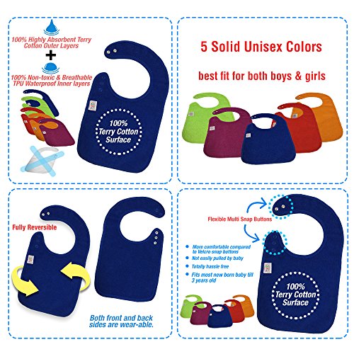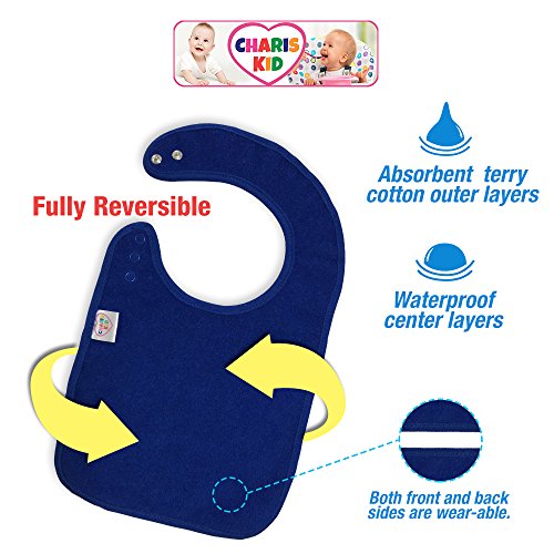 CHARIS KID 100% Cotton Baby Bibs will solve your problems! - Three Layers Protection - with waterproof inner layer between two soft, thick absorbent outer 100% Terry cotton layers. It is so SOFT and QUIET, Yet WATERPROOF!