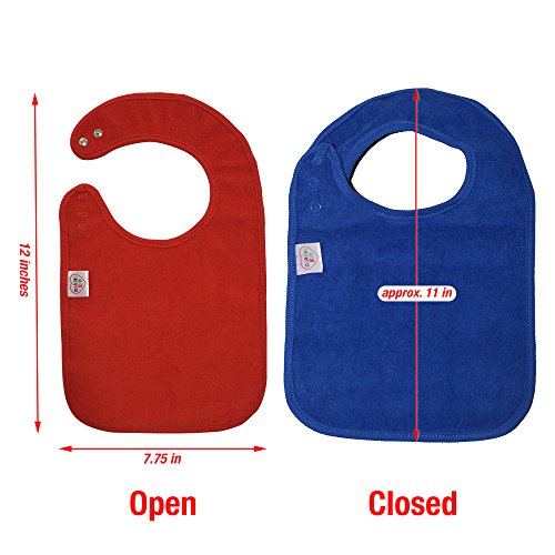 FLEXIBLE THREE SNAPS POSITIONS & SIDE FRONT SNAPS DESIGN & REVERSIBLE - and SO FLEXIBLE that it fits new born to 3 years old toddlers. Using snap buttons are more comfortable compare to Velco closure, and not easily pull out by your babies - it is truly hassle-free. You can reverse front and back when you wear the bib. One side left with stain, just reverse and use another side. This makes your bib more reusable, and value for the money!