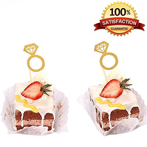 Kakasogo 50PCS Newest Wedding Bridal Shower Gold Glitter Diamond Ring Cupcake Cake Topper Picks for Marriage Engagement Anniversary Birthday Valentines Party Cake Decor