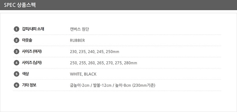 - 제품소재갑피 및 내피 - 캔버스원단 / 아웃솔 - RUBBER