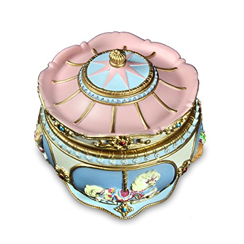 - Feature : 18-note musical movement plays "Carousel Waltz" while the horse gently spins. Winds-up on the underside. / Inside cream-colored flock lining and beautiful gold-colored edging. / Sculpted horse behind window under the lid creates a shadow box effect inside. / Appearance of fine English creamware. Finished all around; four horses decorate the sides. / 4.25" across x 4" high when closed. Made of resin. Solid, heavy feel. Attractively boxed.
