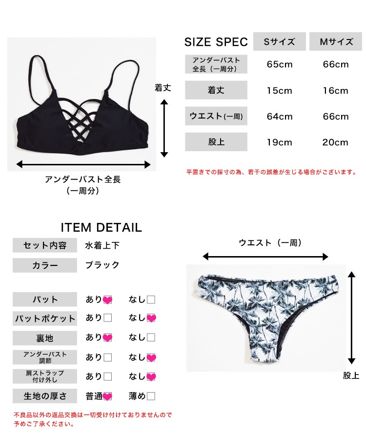 | サイズ | [S] アンダーバスト全長(一周分):65cm 着丈:15cm ウエスト(一周):64cm 股上:19cm [M] アンダーバスト全長(一周分):66cm 着丈:16cm ウエスト(一周):66cm 股上:20cm |