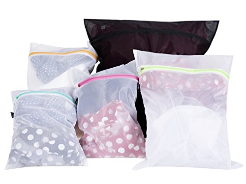 1)Protect your delicates If you've tried any ordinary laundry wash bags, you'll notice the Inside Smarts difference in no time. Bagail Wash Bags are made of premium-grade mesh that makes them as strong & durable as they are luxurious & smooth. 2)Keep everything in its Place. Keep like-colors separated using the 4 white wash bags for light-colored loads, and the 1 large black bag for dark-colored items. 3) Make every Wash Quiet & Safe. Zippered mesh laundry bags can be noisy, but not this new, Slip the rustproof zipper under the smart zipper guard to protect & ensure a quiet, snag-free wash. 4) Quality GUARANTEE, Life Time warranty. If our laundry bags have any quality problem or any other problems,please return it for a full refund.Do not hesitate to try these great laundry bags.Any questions,please contact us freely and we will at your service. These smart wash bags are best gifts for family members and friends!!!