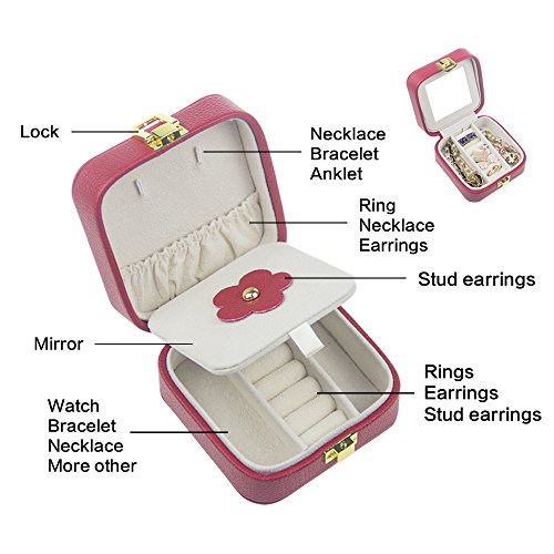 - ★Carrying small jewelry--This cute small jewelry box can be stored earrings, ear Studs,ring,necklaces, bracelets, watches, bracelets and more other.It also comes with a little makeup mirror.