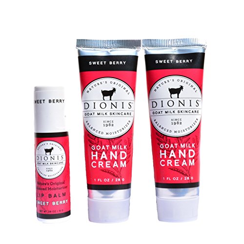 -. Feature : Three item set that includes two 1 oz tubes of Goat Milk Hand Creams and one .28 oz Lip Balm in Sweet Berry Fragrance. / Fragrance Description: Sweet Berry Hand Cream is a blend of tangy berries blended to delight your senses. Part of the Fruit & Spice Collection. / The goat milk, and vitamins A and D also keep your skin looking great naturally. Our value size lip balm is double the size of standard lip balms and provides long lasting moisture. Paraben free, phthalate free and gluten free. / At Dionis we know that when your skin feels great, you feel great. That's why we have dedicated more than 30 years to promoting the moisturizing benefits of goat milk. / This travel collection has great scents. Also drop one in your handbag, at the office and a drawer in your kitchen.