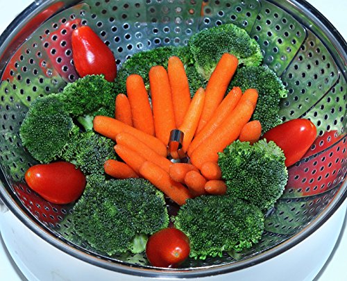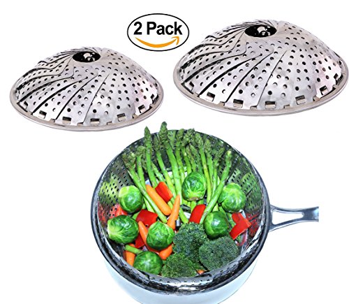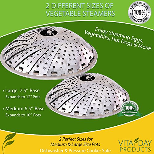 ENJOY FAST, HEALTHY & SIMPLE TO PREPARE MEALS WITH THESE 2 STAINLESS STEEL VEGETABLE STEAMERS. The Medium Size Has a 6 1/2" Base that Expands to 10" Pots, and The Larger Size Has a 7 1/2" Base that Expands Up to 12" Size Pots! • Incredible Value! 2 Steamers for the price of one!
