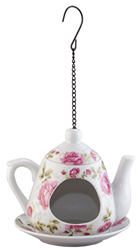 Studio : Miles Kimball Publisher : Miles Kimball Binding : Misc. Product Description This pretty ceramic teapot birdfeeder offers fine dining for your feathered friendsadding a touch of elegance to your landscape or garden. Graced with a charming rose print, the classic bird feeding station features an attached lid and saucer, plus metal chain with hanging hook for easy display. 7" wide x 5 1/2" high with 9 1/2" long chain. 0