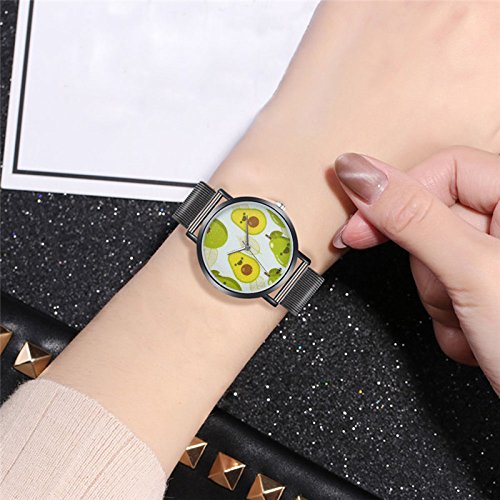 Souarts Womens Mens Slim Steel Strip Avocado Pattern Dial Mesh Band Quartz Analog Wrist Watch 24cm Black