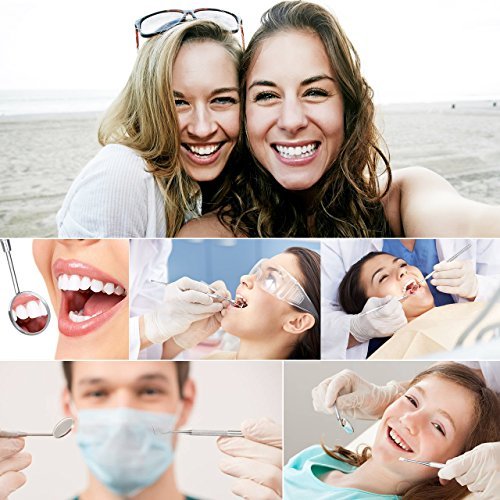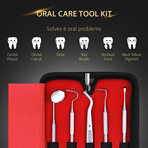 -. Feature : 【TARTAR REMOVER & FRESHEN BREATH & SMILE CONFIDENCE】: These dental tools help you remove stubborn plaque and tartar from your teeth perfectly when you cannot do it with a toothbrush. You can use the Dental tools provided in the Dental Care Kit to remove the tough stains, plague, tartar, bacteria and debris from your teeth and gum. Clean teeth and fresh breath let you smile with confidence / 【DAILY DENTAL CARE INSTRUMENT】: This 5-in-1 dental tools include 1 dental scaler, 1 tweezers, 1 pick, 1 dental mirror, 1 tartar remover, specially designed for both professional dentists and personal oral care. Designed in different angles which is perfect for different sides of your teeth, good for removing tartar, food debris and bacteria, freshening breath, whitening teeth, observing some hard-to-see areas / 【ANTIBACTERIAL & CLEAN & HYGIENE】: The tooth cleaning tool are made of high strength stainless steel with antibacterial coating, polished to a mirror finish, this rust-free oral hygiene tool kit is strong and sharp enough to remove plaque and heavy tartar in or between your teeth without hurting your gums / 【ALSO USE FOR PETS】: This professional dental hygiene kit is not only used for personal care, it also can be used to keep your pet teeth clean and refresh. Make you closer to your dog and cat / 【PU LEATHER ZIPPER CASE For EASY STORAGE】: Comes in a durable zipper case to keep your dental tools organized and clean during travel. And protect your tools from being scratched at all times