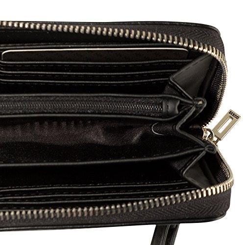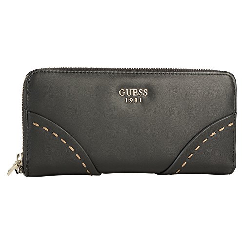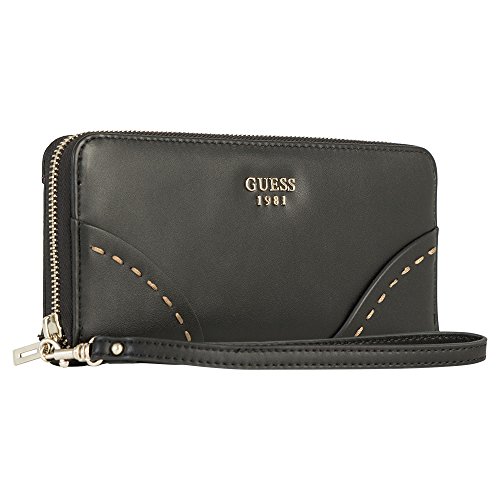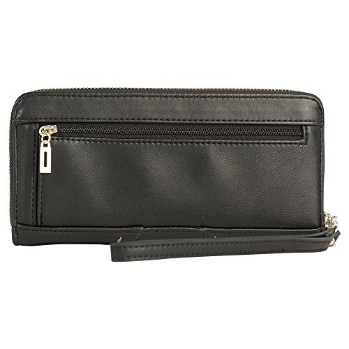 -. Binding : Apparel -. Brand : GUESS -. Color : Black -. Department : womens -. EAN : 0885935870313 -. Feature : Logo embossed faux leather with stud detail / Zip around closure; Pale gold-tone hardware / Back zipper pocket; Removable wristlet carry strap / Interior features central zip pocket, 12 card slots, and additional slip pockets for currency. / Measurements: 8"W x 4.5"H x 1"D -. PackageQuantity : 1 -. ProductGroup : Apparel -. ProductTypeName : SHOES -. Size : Large -. Title : GUESS Women's Julana Large Zip Around Clutch Wallet Bag -. UPC : 885935870313
